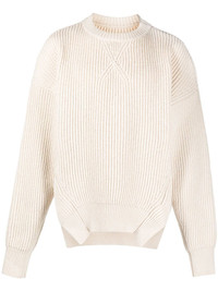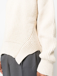 ribbed knit jumper ecru cotton-wool blend ribbed knit crew neck long sleeves asymmetric design Made in Italy Composition Cotton 50%, Wool 50% SIZE & FIT Model measurements Height 6 ft 2 in(1.87 m) Bust/Chest 36.22 in(92 cm) Hips 37 in(94 cm) Waist 27.95 in(71 cm) Measurement CHEST 48.81 in(124 cm) SLEEVE LENGTH 21.25 in(54 cm) FittingInformation This piece fits true to size. We recommend you get your regular size Cut for a loose fit Made with a mid-weight fabric Washing instructions Dry Clean Only