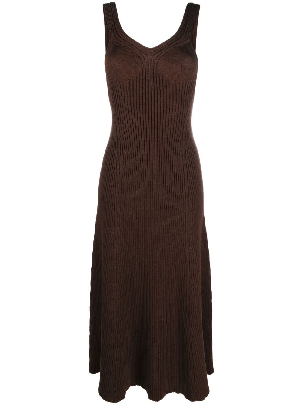 ribbed-knit midi dress Jil Sanders leans into its minimalist aesthetic with this tonal-brown dress. Crafted from stretch cotton in a ribbed knit construction, the dress falls from the waist into a slightly flared midi skirt for a timeless look. Highlights - Brown - Cotton blend - Ribbed knit - V-neck - Open back - Flared - Calf-length Made in Italy Composition Cotton 90%, Polyamide 10% SIZE & FIT Model measurements Height 5 ft 11 in(1.8 m) Bust/Chest 31.49 in(80 cm) Hips 35.82 in(91 cm) Waist 24.8 in(63 cm) FittingInformation Designed for a close fit at the chest and waist with a loose fit at the hip Made with a midweight knit, this piece offers some stretch This piece fits true to size – take your usual size Washing instructions Dry Clean Only