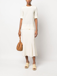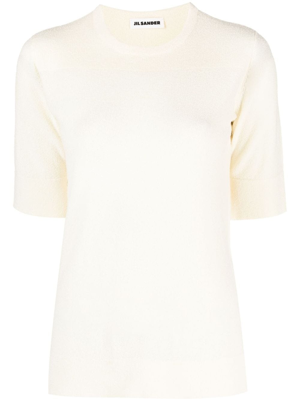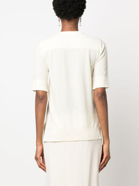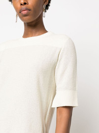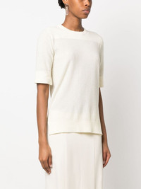 round-neck knitted T-shirt Highlights - Cream white - Cotton blend - Knitted construction - Textured finish - Round neck - Short sleeves - Straight hem Made in Italy Composition Cotton 64%, Polyester 36% SIZE & FIT Model measurements Height 5 ft 11 in(1.8 m) Bust/Chest 31.88 in(81 cm) Hips 35.03 in(89 cm) Waist 24.01 in(61 cm) FittingInformation Designed for a slim fit that sits just away from the body offering a close yet comfortable fit Made with a midweight knit, this piece offers some stretch This piece fits true to size – take your usual size Washing instructions Dry Clean Only