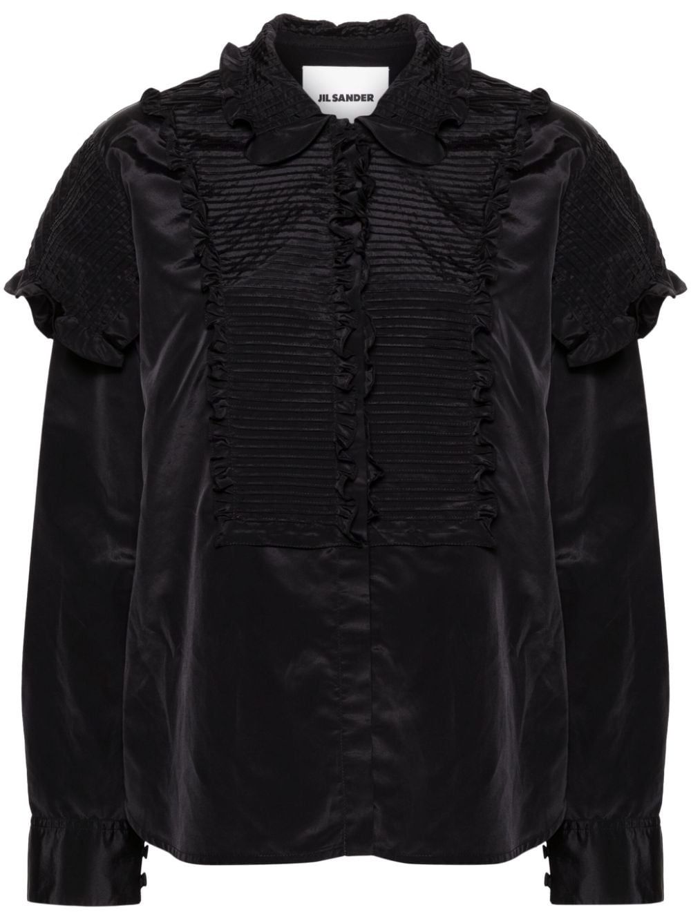 ruffled button-up blouse Highlights - Black - High-shine finish - Pleat detailing - Ruffled detailing - Frilled neckline - Concealed front button fastening - Long sleeves - Buttoned cuffs - Curved hem Made in Italy Composition Polyamide 64%, Silk 36% SIZE & FIT Model measurements Height 5 ft 10 in(1.78 m) Bust/Chest 31.49 in(80 cm) Hips 35.03 in(89 cm) Waist 23.62 in(60 cm) FittingInformation Designed to be unstructured, offering a loose fit throughout Made from a lightweight non-stretch fabric This piece fits true to size – take your usual size