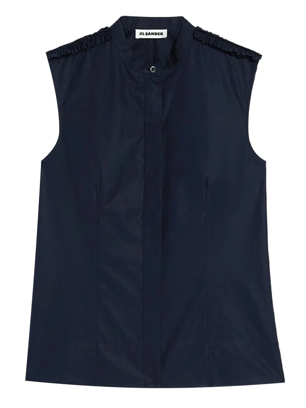 ruffled collarless shirt Highlights - Navy blue - Shoulder ruffles - Stand collar - Concealed button closure - Sleeveless Made in Italy Composition Cotton 100% Washing instructions Read Manufacturer Guidelines