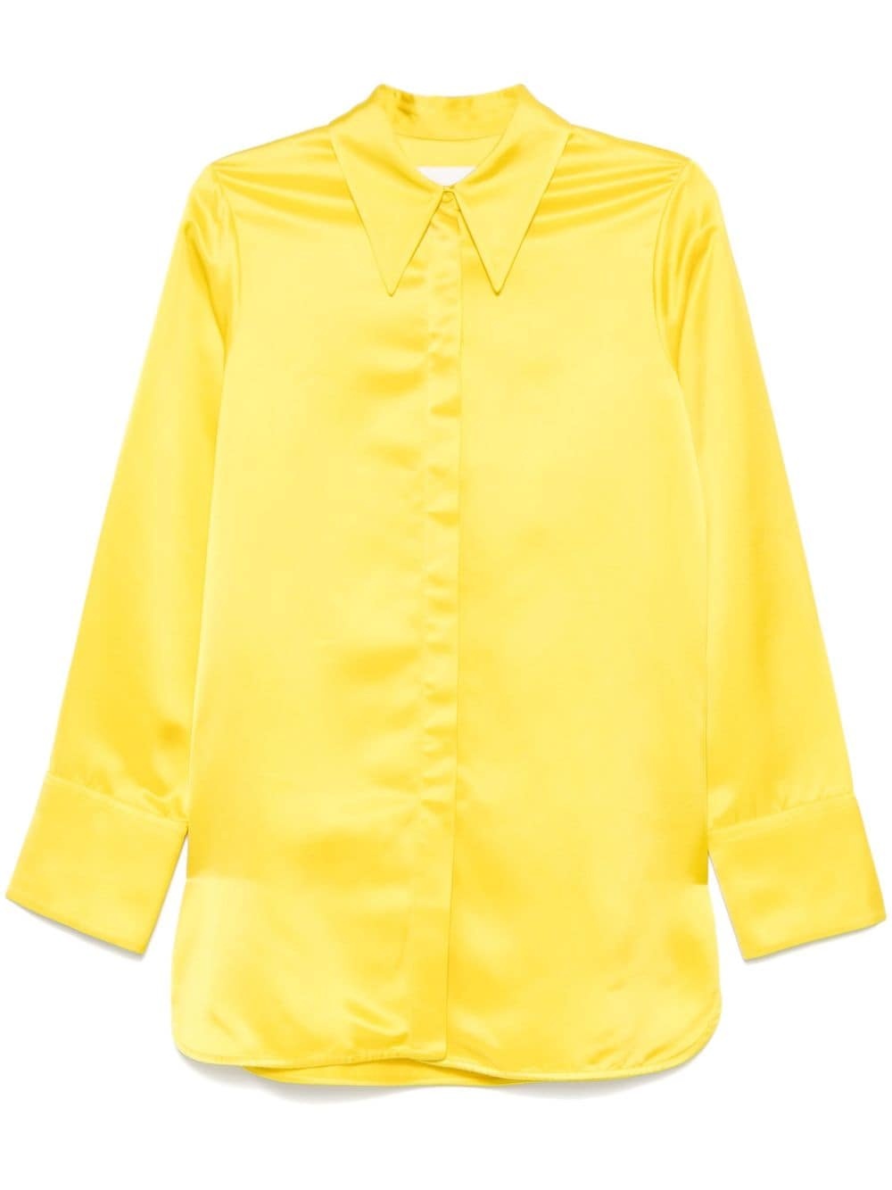 satin shirt Highlights - Lemon yellow - Satin weave - Concealed front button fastening - Pointed flat collar - Long sleeves with buttoned cuffs - Short side slits - Curved hem Made in Italy Composition Cupro 56%, Viscose 44% SIZE & FIT Model measurements Height 5 ft 10 in(1.78 m) Bust/Chest 32.67 in(83 cm) Hips 35.43 in(90 cm) Waist 23.22 in(59 cm) FittingInformation Designed to be unstructured, offering a loose fit throughout Made from a midweight non-stretch fabric