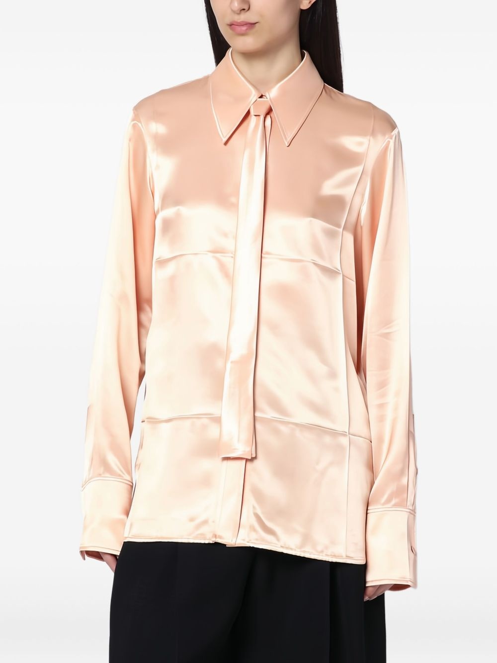 satin tie-neck shirt Highlights - Soft peach - Classic collar - Button-up front - Tie detail at neck - Long sleeves Made in Italy Composition Outer: Viscose 67%, Cupro 33% Lining: Viscose 100%, Cotton 100% Washing instructions Read Manufacturer Guidelines