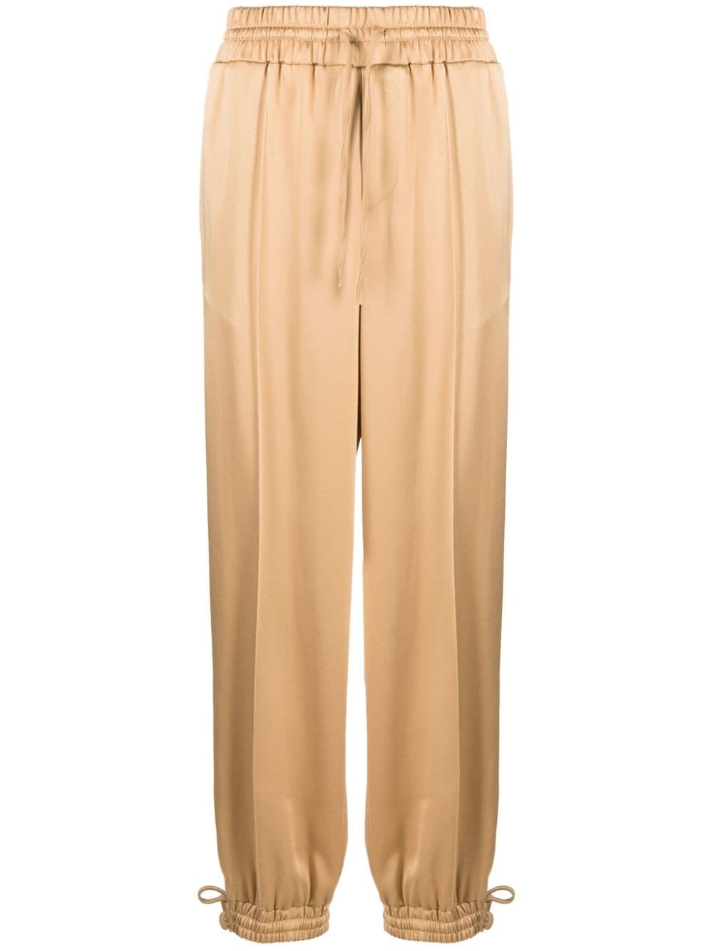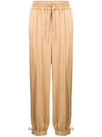 satin track pants Championing minimalism, Jil Sander proposes clothing and accessories that are understated yet unique. A case in point, these beige trousers are cut to a relaxed, sporty track silhouette with an elasticated drawstring waistband and cuffs elevated by its unconventional satin construction, lending lustre. Highlights - Beige - Satin weave - Pressed crease - Elasticated drawstring waistband - Two side slash pockets - Two rear patch pockets - Elasticated drawstring cuffs - Straight leg Made in Italy Composition Acetate 74%, Viscose 26% SIZE & FIT Model measurements Height 5 ft 11 in(1.8 m) Bust/Chest 34.25 in(87 cm) Hips 35.82 in(91 cm) Waist 24.8 in(63 cm) FittingInformation Designed for a relaxed tapered cut, these trousers allow for a close fit at the waist and offer a loose fit at the thighs, with a closer fit toward the ankles The elasticated waist and hem offer a secure, comfortable fit Made from a midweight non-stretch fabric This piece fits true to size – take your usual size Washing instructions Dry Clean Only