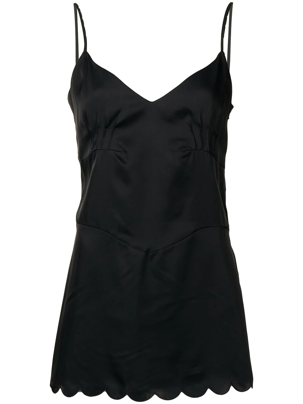satin V-neck spaghetti-strap top midnight blue V-neck spaghetti straps satin finish pintuck detailing bias cut V-back scallop hem long length Made in Italy Composition Body: Viscose 100% SIZE & FIT Model measurements Height 5 ft 9 in(1.76 m) Bust/Chest 29.13 in(74 cm) Hips 33.07 in(84 cm) Waist 22.83 in(58 cm) FittingInformation This piece fits true to size. We recommend you get your regular size Cut for a relaxed fit Made with a mid-weight non-stretch fabric Washing instructions Dry Clean Only
