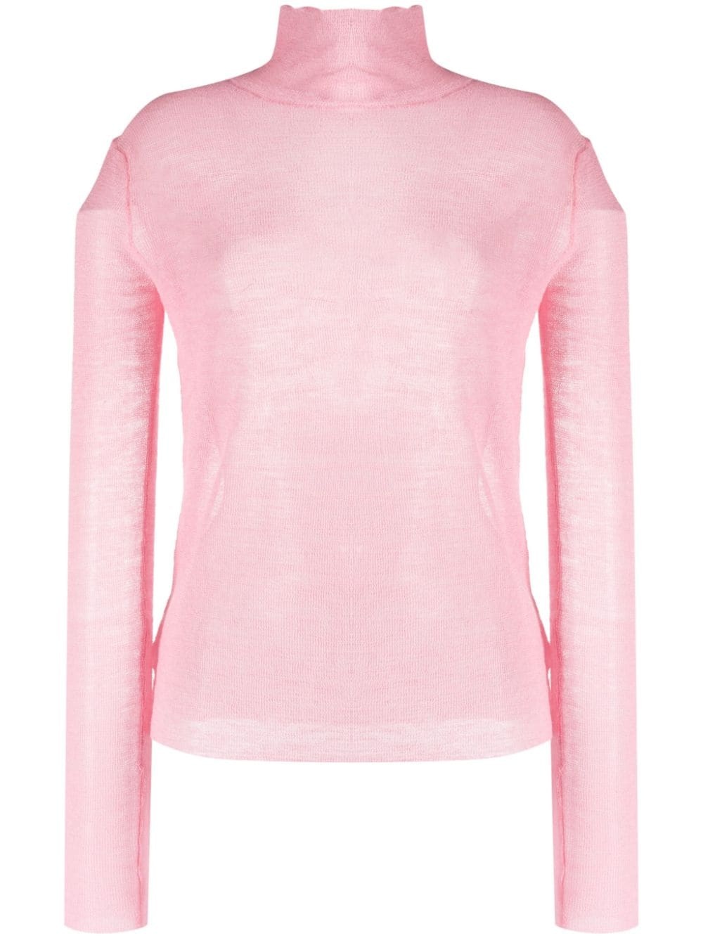 semi-sheer logo-patch jumper Highlights - Light pink - Wool - Fine knit - Roll neck - Semi-sheer construction - Long sleeves - Logo patch to the rear - Frayed hem Made in Italy Composition Wool 100% SIZE & FIT Model measurements Height 5 ft 10 in(1.78 m) Bust/Chest 31.49 in(80 cm) Hips 37 in(94 cm) Waist 23.62 in(60 cm) FittingInformation Designed for a slim fit that sits just away from the body offering a close yet comfortable fit Made with a lightweight knit, this piece offers some stretch This piece fits true to size – take your usual size Washing instructions Dry Clean Only