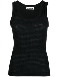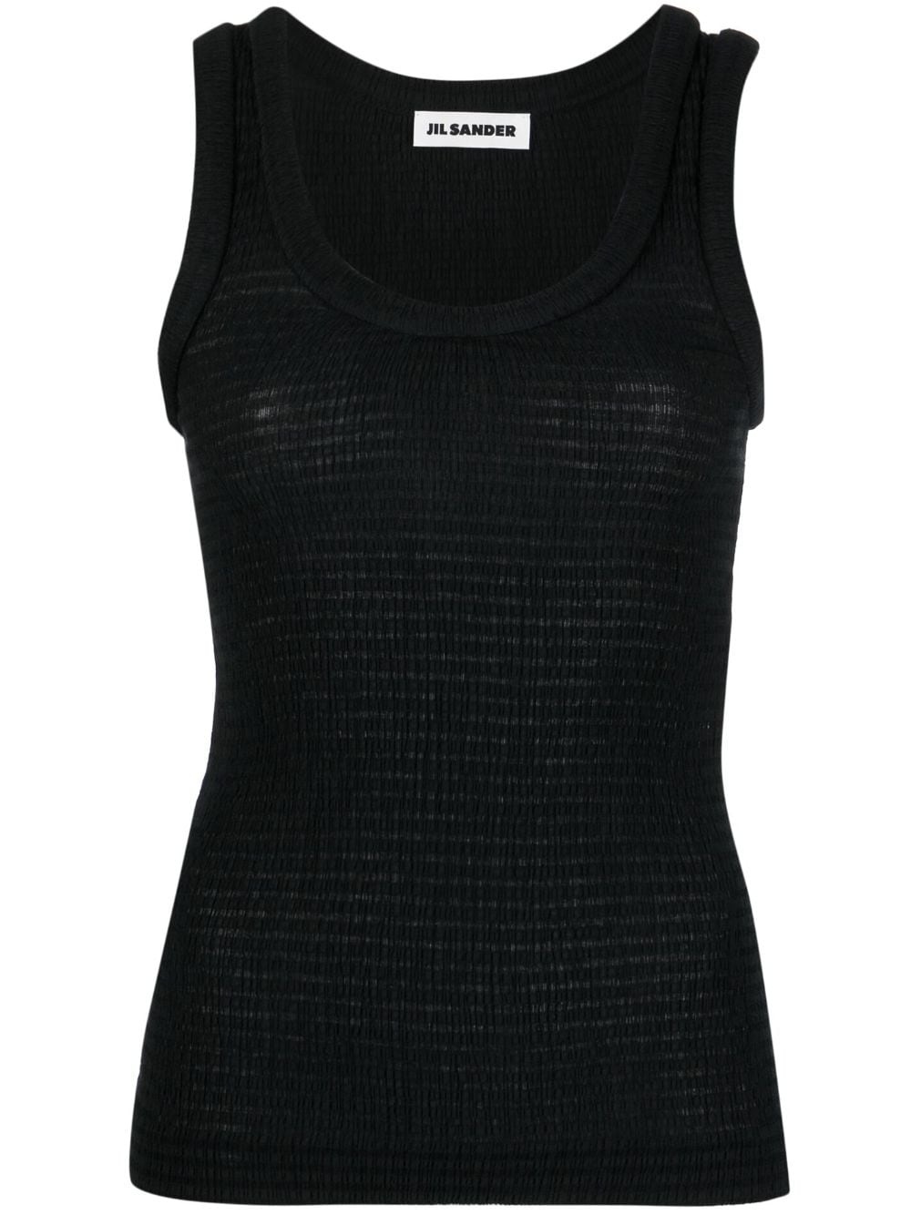 shirred tank top This black tank top taps into Jil Sander’s understated aesthetic. It’s cut to a scoop neck silhouette enhanced with stretch shirring. Highlights - Black - Cotton blend - Scoop neck - Sleeveless - Racerback - Shirred effect - Stretch-design - Straight hem Made in Italy Composition Polyester 69%, Cotton 30%, Elastane 1% SIZE & FIT Model measurements Height 5 ft 10 in(1.78 m) Bust/Chest 30.7 in(78 cm) Hips 34.64 in(88 cm) Waist 23.22 in(59 cm) FittingInformation Designed for a close fit throughout Made from a lightweight stretch fabric, this piece offers elasticity and flexibility when worn This piece fits true to size – take your usual size Washing instructions Dry Clean Only