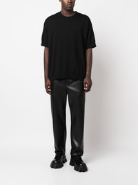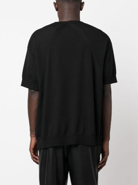 short-sleeve wool T-shirt Highlights - Black - Wool - Crew neck - Drop shoulder - Short sleeves - Ribbed cuffs and hem Made in Italy Composition Wool 100% SIZE & FIT Model measurements Height 6 ft 0 in(1.84 m) Bust/Chest 35.82 in(91 cm) Hips 37 in(94 cm) Waist 28.34 in(72 cm) FittingInformation Designed to be unstructured, offering a loose fit throughout Made with a lightweight knit, this piece offers some stretch This piece fits true to size – take your usual size Washing instructions Dry Clean Only