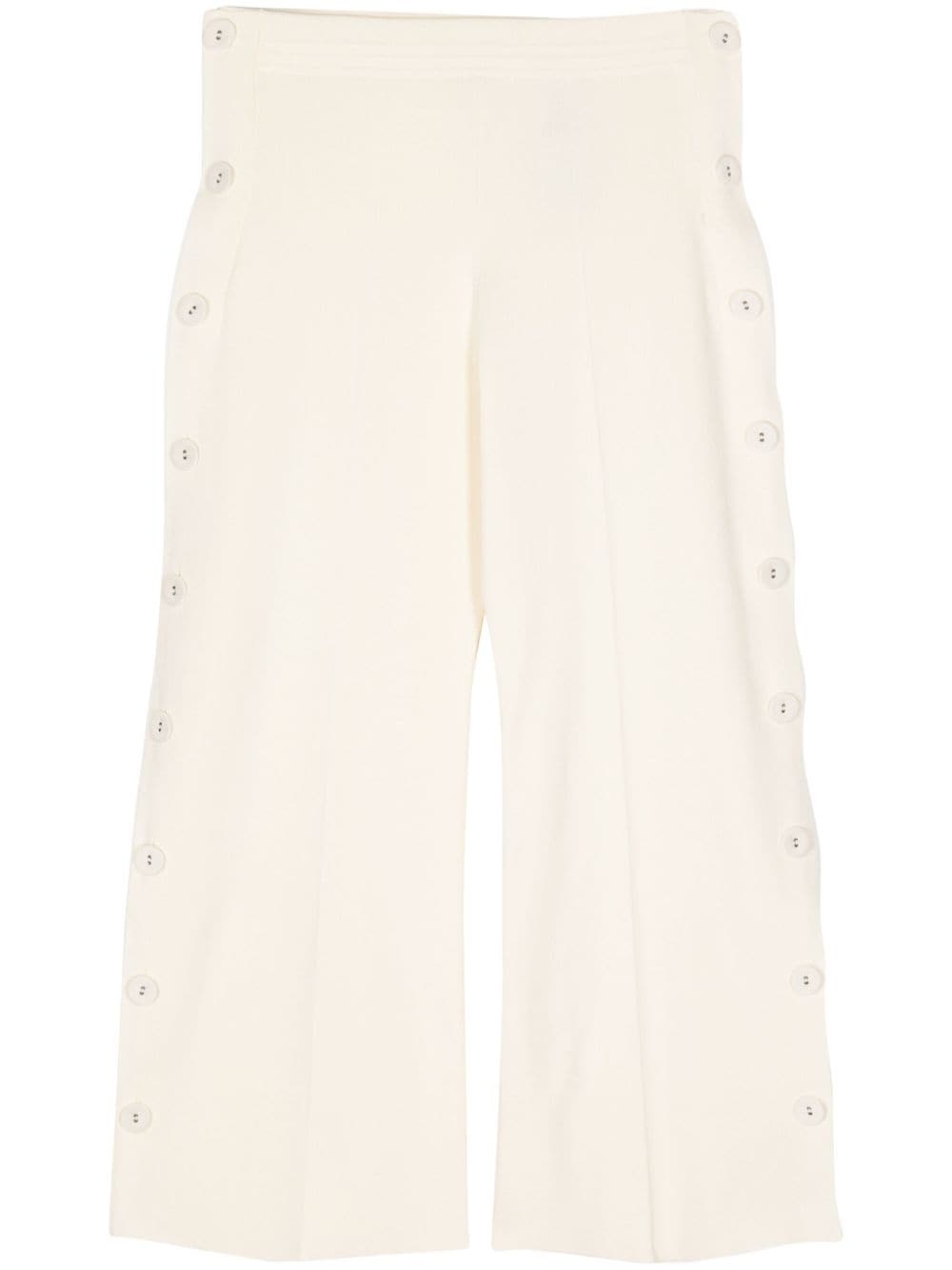 side-button straight-leg trousers Highlights - Off-white - Cotton blend - High-waisted - Side button fastening - Straight leg Made in Italy Composition Cotton 95%, Polyamide 4%, Nylon 1% SIZE & FIT Measurement BACK RISE 13.38 in(34 cm) FRONT RISE 12.2 in(31 cm) HIPS 37 in(94 cm) INSIDE LEG 29.13 in(74 cm) Outside Leg 40.55 in(103 cm) WAIST 27.55 in(70 cm)