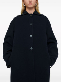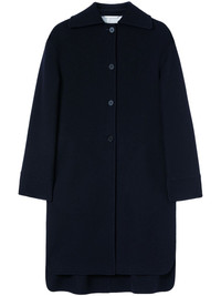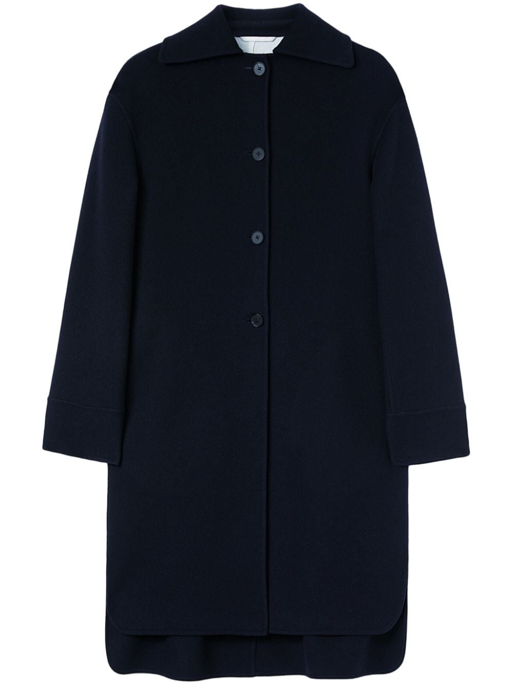 single-breasted cashmere coat Highlights - Navy blue - Cashmere - Spread collar - Front button fastening - Drop shoulder - Long sleeves - Buttoned cuffs - High-low hem - Two side inset pockets Made in Italy Composition Cashmere 100% SIZE & FIT FittingInformation Designed to be unstructured, offering a loose fit throughout Made from a midweight non-stretch fabric This piece fits true to size – take your usual size Washing instructions Read Manufacturer Guidelines