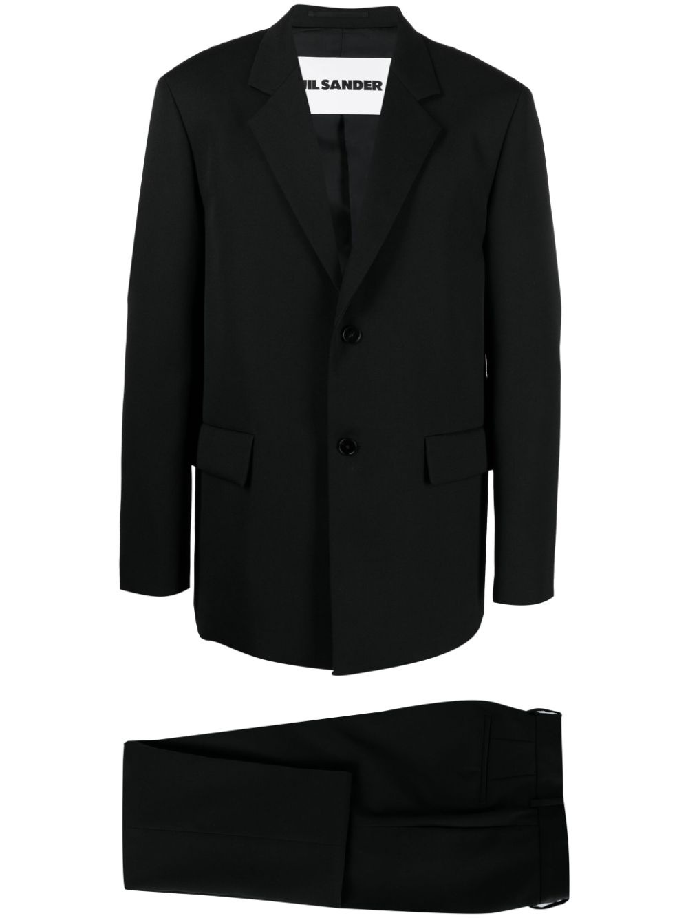 single-breasted straight-leg suit Highlights - Black - Jacket: - Notched lapels - Front button fastening - Long sleeves - Split cuffs - Two side flap pockets - Central rear vent - Trousers: - Pressed crease - Belt loops - Concealed front fastening - Straight leg - Two side inset pockets - Two rear jetted pockets Made in Italy Composition Outer: Wool 100% Lining: Cotton 100%, Cupro 100% SIZE & FIT Model measurements Height 6 ft 1 in(1.86 m) Bust/Chest 37.4 in(95 cm) Hips 36.22 in(92 cm) Waist 29.52 in(75 cm) FittingInformation Tailored with a boxy silhouette, offering a loose fit throughout The unfinished hems allow for the length to be altered Made from a midweight non-stretch fabric This piece fits true to size – take your usual size Washing instructions Dry Clean Only