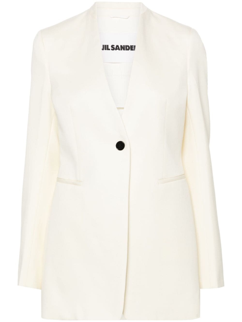 single-breasted wool blazer Highlights - Ecru - Wool - Interlock twill weave - Dart detailing - No lapels - Front button fastening - Shoulder pads - Long sleeves - Buttoned cuffs - Two front welt pockets - Italian rear vents - Straight hem - Full lining Made in Italy Composition Lining: Viscose 100%, Cotton 100% Outer: Wool 100% SIZE & FIT Model measurements Height 5 ft 10 in(1.77 m) Bust/Chest 32.28 in(82 cm) Hips 35.03 in(89 cm) Waist 25.19 in(64 cm) FittingInformation Designed for a slim fit that sits just away from the body offering a close yet comfortable fit The internal shoulder pads offer a structured shape Made from a midweight non-stretch fabric This piece fits true to size – take your usual size