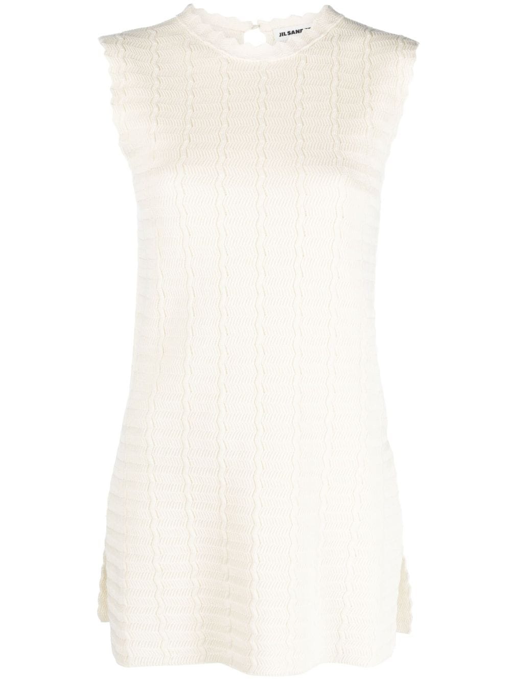 sleeveless knitted top Presented in a muted ivory colourway, this sleeveless knitted top encapsulates Jil Sander's understated aesthetic. It features a delicate zigzag design and is trimmed with scalloped edges. Highlights - Cream white - Cotton blend - Knitted construction - Crew neck - Scallop edge - Keyhole detail to the rear - Sleeveless - Side slits - Long length Made in Italy Composition Cotton 91%, Viscose 9% SIZE & FIT Model measurements Height 5 ft 11 in(1.8 m) Bust/Chest 32.67 in(83 cm) Hips 36.22 in(92 cm) Waist 24.4 in(62 cm) FittingInformation Designed for a relaxed fit, this piece allows for comfort and movement when worn Made with a midweight knit, this piece offers some stretch This piece fits true to size – take your usual size Washing instructions Dry Clean Only