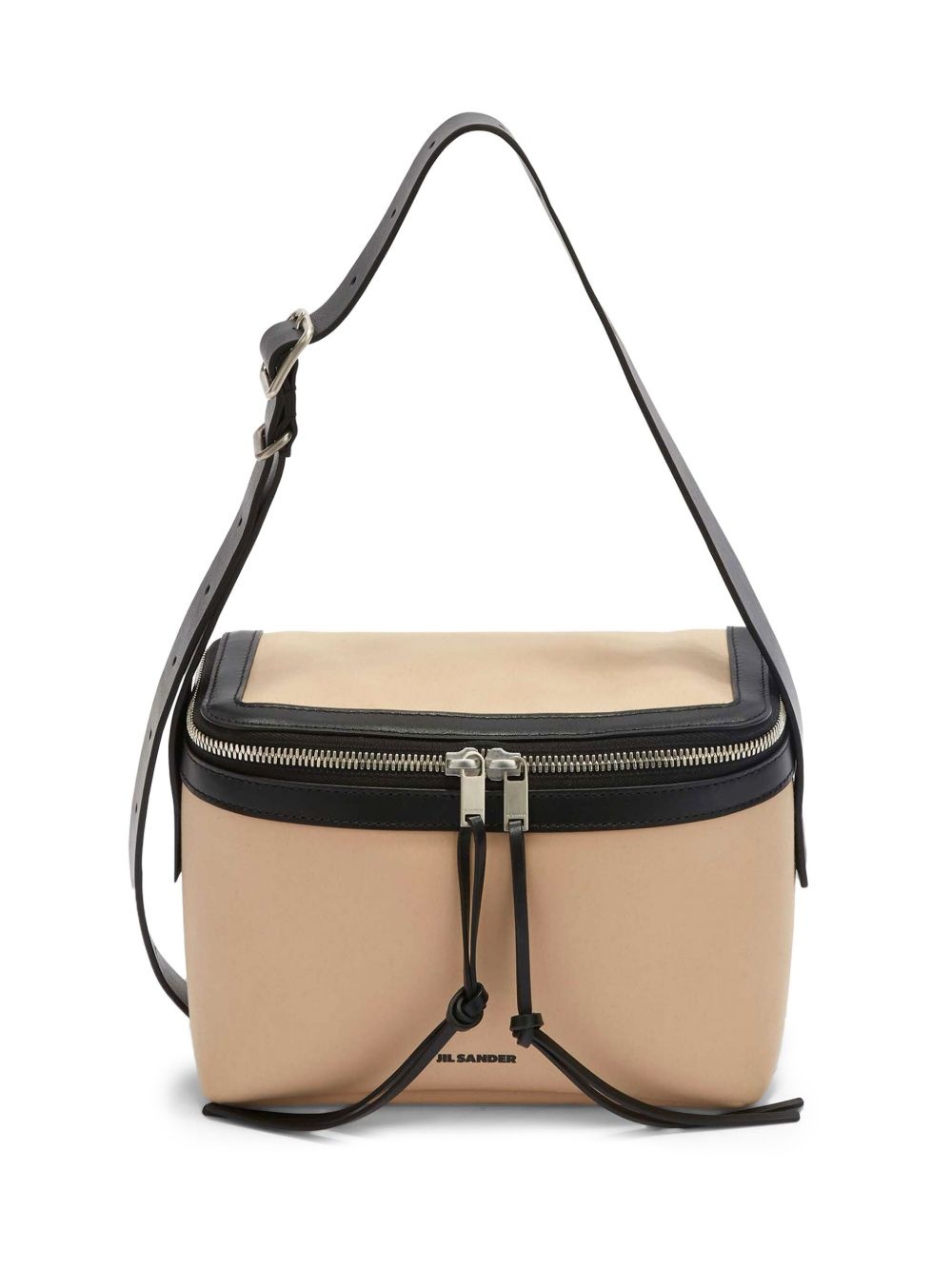 small leather shoulder bag Famed for their minimalist vision, Jil Sander presents this shoulder bag in a black and light brown colour scheme. Crafted from leather, its design emphasises the simplicity and timelessness of the brand. Highlights - Light brown - Black - Calf leather - Cotton - Logo print to the front - Adjustable shoulder strap - Front zip fastening - Main compartment Made in Italy Composition Outer: Calf Leather 100%, Cotton 100% Lining: Sheepskin 100%