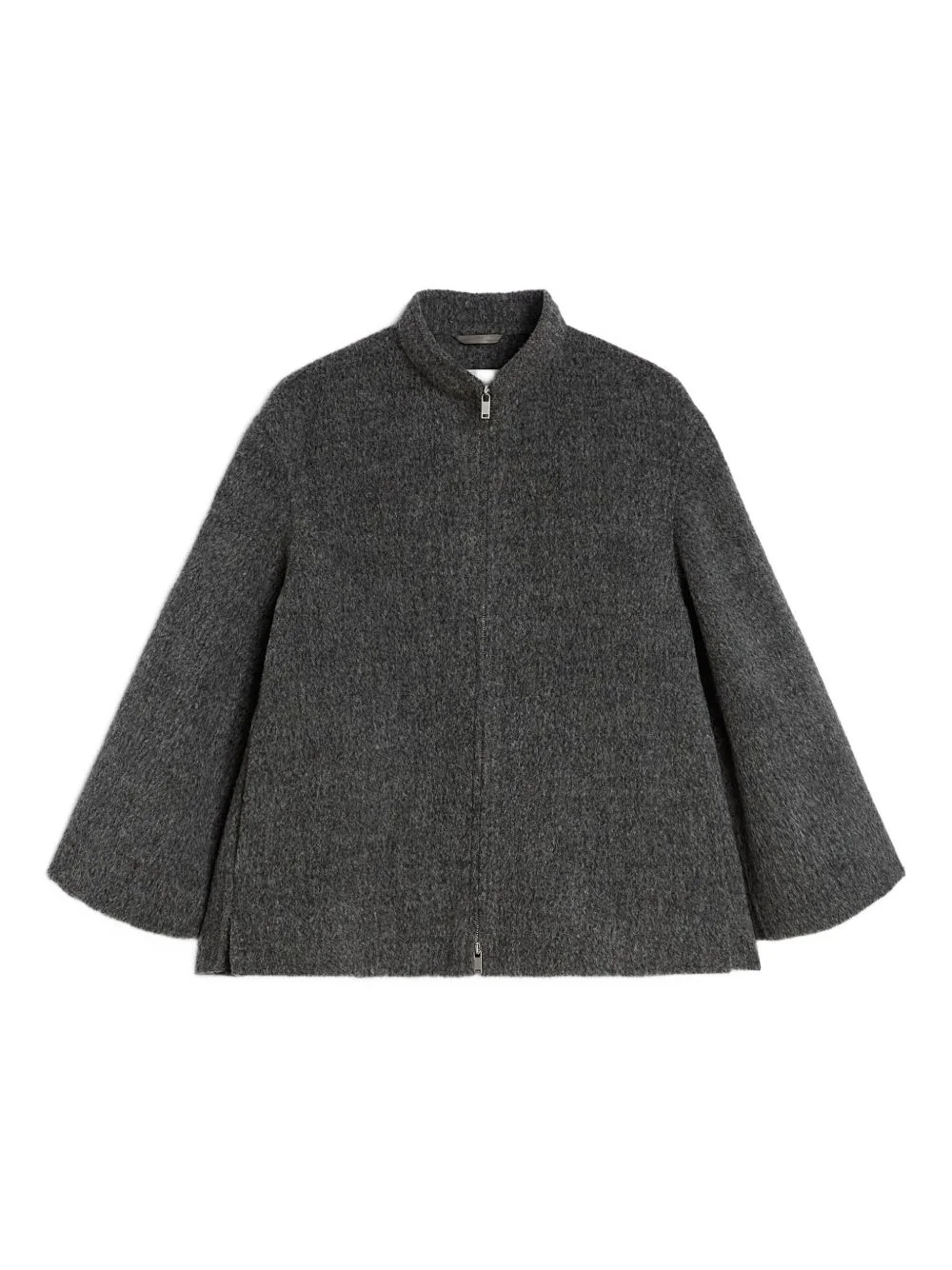 stand-up collar fleece jacket Highlights - Light grey - Stand-up collar - Front zip closure - Dropped shoulders - Wide sleeves Made in Italy Composition Alpaca 73%, Polyamide 24%, Wool 3% Washing instructions Read Manufacturer Guidelines