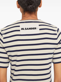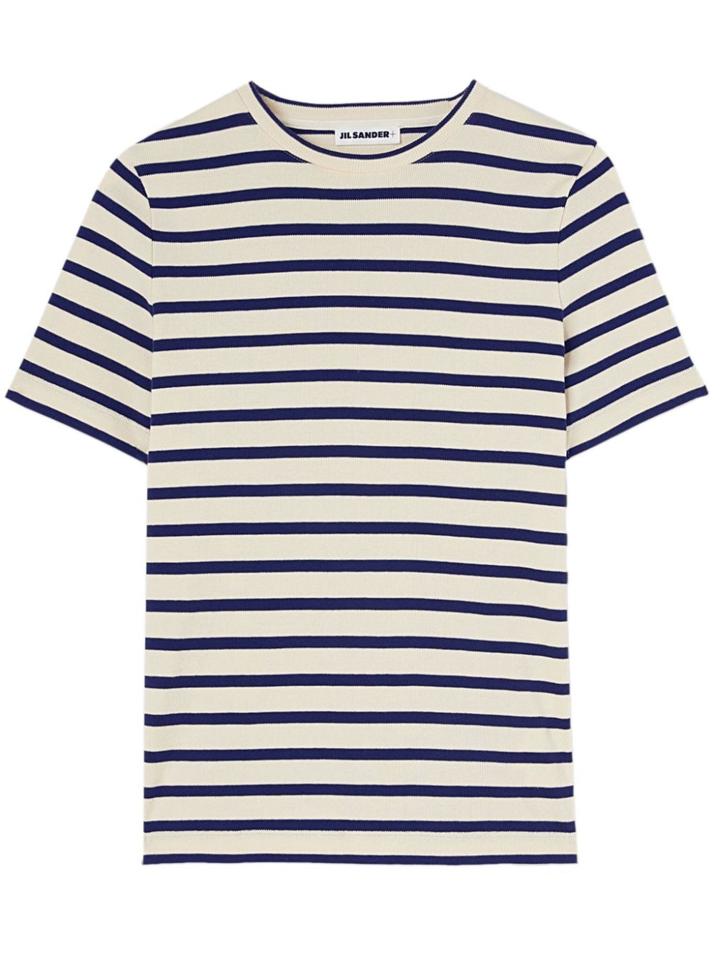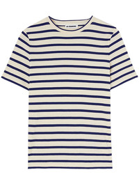 striped cotton T-shirt This striped shirt hails from the Jil Sander+ line – a collection of practical, nature-inspired garments designed for outdoor life. It’s ribbed-knit from pure cotton with a sizable logo patch at the nape. Highlights - Cream white/navy blue - Cotton - Fine ribbed - Horizontal stripe pattern - Logo patch to the rear - Round neck - Short sleeves - Straight hem Made in Italy Composition Cotton 100% SIZE & FIT Model measurements Height 5 ft 10 in(1.78 m) Bust/Chest 31.49 in(80 cm) Hips 37 in(94 cm) Waist 23.62 in(60 cm) Measurement LENGTH 24.4 in(62 cm) WAIST 30.7 in(78 cm) Washing instructions Hand Wash
