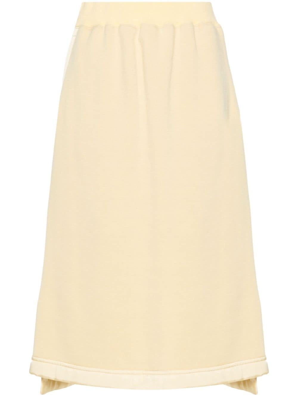 virgin wool-blend midi skirt Spun in Italy from a plush blend of virgin wool and cotton, this midi skirt from Jil Sander is designed in a pastel yellow hue that reveals the brand's exploration of texture and colour. It sits high at the waist with an elasticated band and is fitted with tonal satiny stripes at the sides. Highlights - Pastel yellow - Virgin wool blend - High-waisted - Elasticated waistband - Two side slit pockets - Side stripe detailing - Side slits - High-low hem - Mid-calf length Made in Italy Composition Outer: Virgin Wool 64%, Cotton 36% Lining: Viscose 100% SIZE & FIT Model measurements Height 5 ft 9 in(1.76 m) Bust/Chest 33.07 in(84 cm) Hips 34.64 in(88 cm) Waist 25.59 in(65 cm) FittingInformation This midi-length skirt is intended to be worn high on the waist The elasticated waist allows for a comfortable fit Made from a midweight non-stretch fabric, this piece offers minimal elasticity when worn This piece fits true to size – take your usual size Washing instructions Dry Clean Only