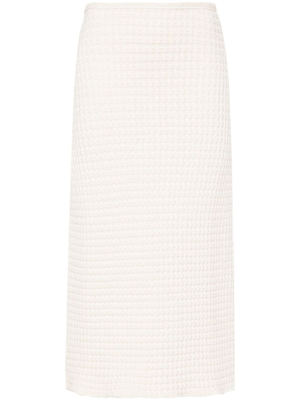 waffle-knit skirt Highlights - Cream white - Cotton - Knitted construction - Waffle knit - Below-knee length - Concealed side zip fastening Made in Italy Composition Cotton 100% SIZE & FIT Model measurements Height 5 ft 11 in(1.8 m) Bust/Chest 31.49 in(80 cm) Hips 36.61 in(93 cm) Waist 24.4 in(62 cm) Measurement WAIST 23.62 in(60 cm) HIPS 28.34 in(72 cm) LENGTH 30.7 in(78 cm) FittingInformation This midi-length skirt is intended to be worn high on the waist Made with a midweight knit, this piece offers some stretch This piece fits true to size – take your usual size Washing instructions Dry Clean Only