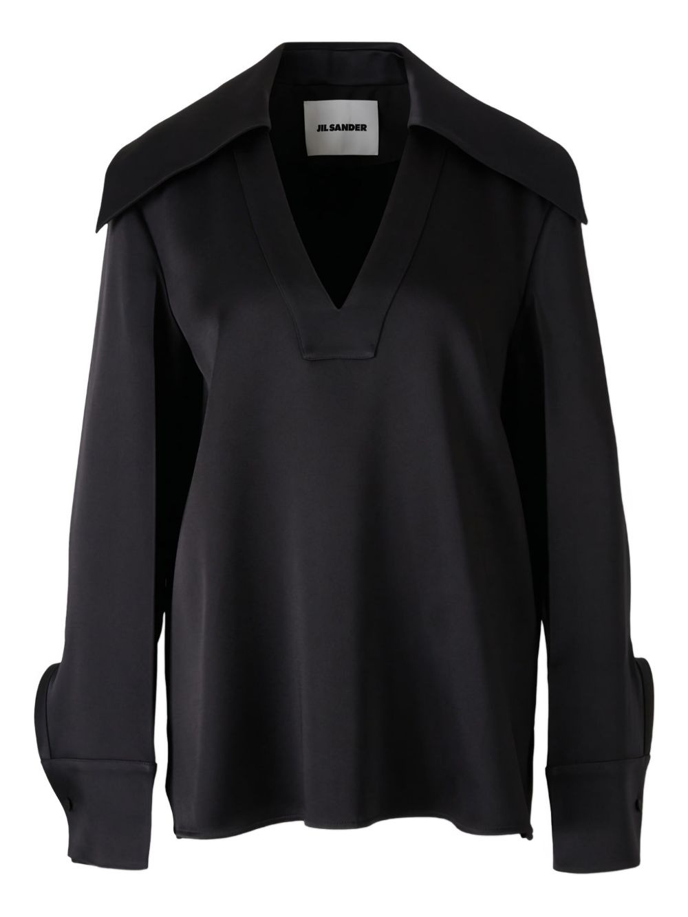 wide-collar satin blouse Highlights - Black - V-neck - Wide collar - Long sleeves - Buttoned cuffs Imported Composition Fabric 100% Washing instructions Read Manufacturer Guidelines