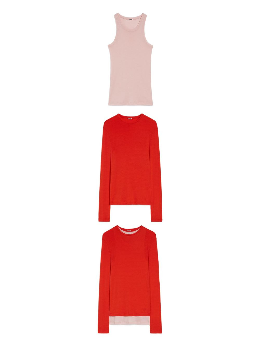 wool layered T-shirt Highlights - Bright red - Crew neck - Long sleeves - Embroidered logo Made in Italy Composition Virgin Wool 100% Washing instructions Read Manufacturer Guidelines