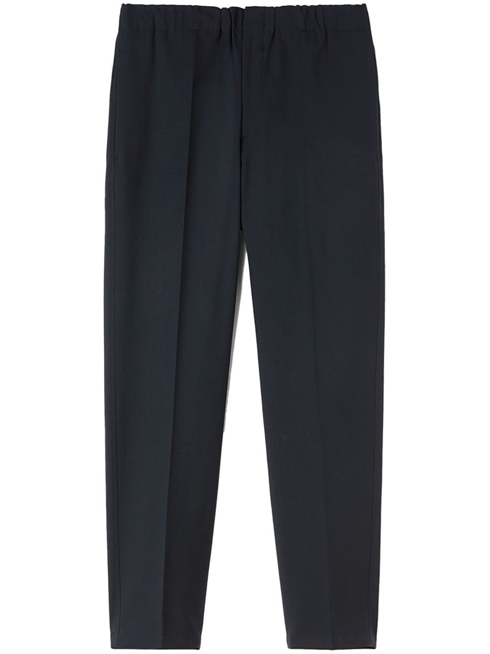 wool tapered trousers Highlights - Navy blue - Wool - Twill weave - Pressed crease - Ruched detailing - Mid-rise - Tapered leg - Slip pockets to the sides - Two rear flap pockets - Unlined - Zip fly fastening - Front button fastening - Elasticated waistband Made in Italy Composition Outer: Wool 100% Lining: Cotton 100% SIZE & FIT FittingInformation Designed for a tapered leg, offering a loose unrestricted fit over the leg with a closer fit towards the ankle Adjust this piece’s waistband to your preference using the drawstring Made from a midweight non-stretch fabric This piece fits true to size – take your usual size