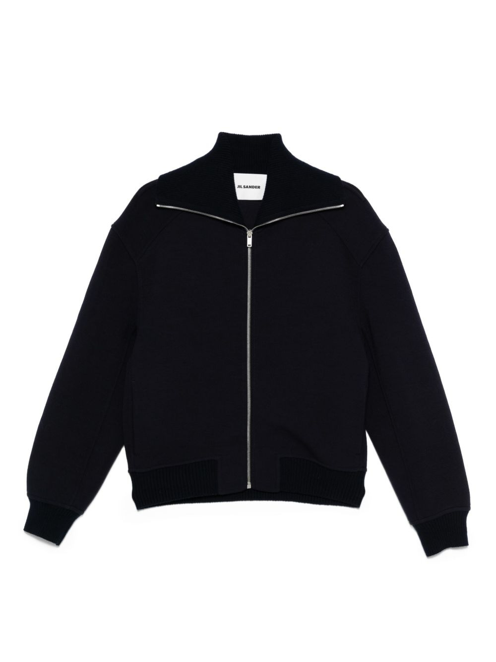 zip-up jacket Highlights - Dark blue - Zip fastening - High neck - Ribbed hem - Drop shoulder Made in Italy Composition Outer: Virgin Wool 67%, Polyamide 33% Lining: Viscose 100% Washing instructions Dry Clean Only