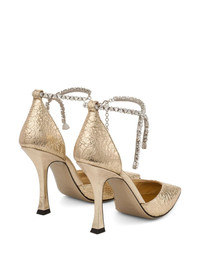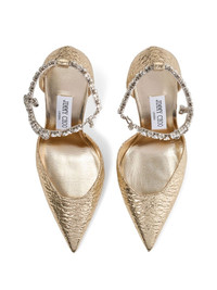 100mm Stevie pumps Highlights - Gold-tone - Goatskin - Crinkled finish - Metallic effect - Side hook and eye fastening - Crystal-embellished ankle strap - 100mm high heel - Pointed toe - Branded leather insole - Leather outsole - Wardrobe icon Made in Italy Composition Lining: Goat Skin 100% Sole: Calf Leather 50%, Rubber 50% Outer: Goat Skin 100%, Leather 63%, Crystal 22%, Metal 5%, Plastic 5%, Salpa 5% SIZE & FIT Measurement HEEL 3.93 in(10 cm)