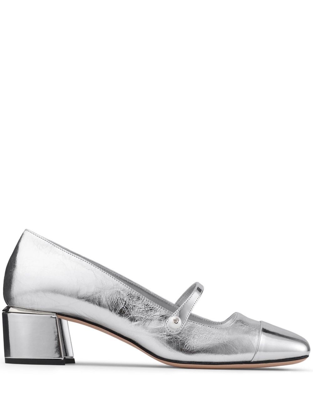 45mm Elisa pumps Highlights - Silver-tone - Calf leather - Crinkled finish - Metallic effect - 45mm low block heel - Strap detailing - Faux-pearl detailing - Square toe - Branded leather insole - Leather outsole Made in Italy Composition Outer: Lamb Skin 70%, Calf Leather 30% Sole: Calf Leather 100% Lining: Goat Skin 100% SIZE & FIT Measurement HEEL 1.77 in(4.5 cm)