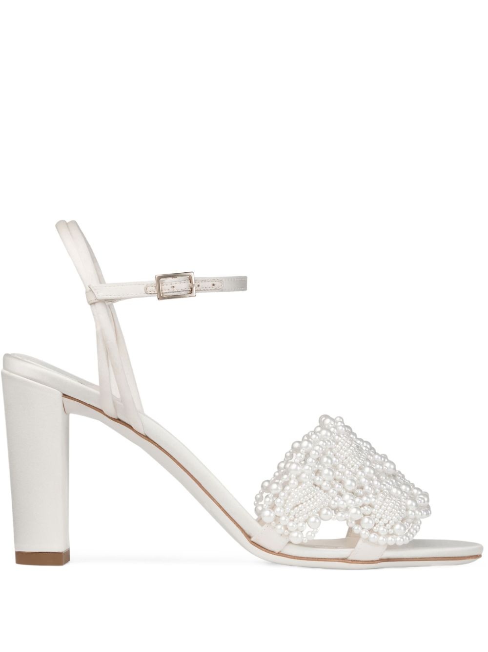Cary 85 Ivory Satin Block Heel Sandal with Pearl Embellishments