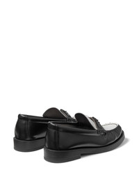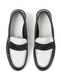 Addie logo-plaque leather loafers Jimmy Choo’s Addie loafers are as classic as they get, save for the JC logo plaque at the penny strap that acts in lieu of a traditional coin. They’re crafted from polished black leather with white vamps and contrast apron stitching at the toes. Highlights - Black/cream white - Lambskin - Logo plaque - Almond toe - Slip-on style - Branded leather insole - Low stacked heel - Rubber sole Made in Italy Composition Leather 100% SIZE & FIT Measurement HEEL 0.98 in(2.5 cm) Sole height 0.39 in(1 cm)