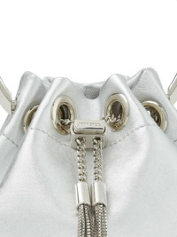 Bon Bon micro bucket bag Highlights - Silver - Metallic finish - Silver-tone hardware - Drawstring fastening - Main compartment - Single rounded top handle - Detachable chain-link shoulder strap - Wardrobe icon Made in Italy Composition Outer: Lambskin 70%, Acrylonitrile Butadiene Styrene (ABS) 5% Lining: Polyurethane 50%, Recycled Polyamide 30%, Polyamide 20% SIZE & FIT Measurement STRAP 21.65 in(55 cm) DEPTH 2.75 in(7 cm) HANDLE 2.36 in(6 cm) WIDTH 4.72 in(12 cm) HEIGHT 4.72 in(12 cm)