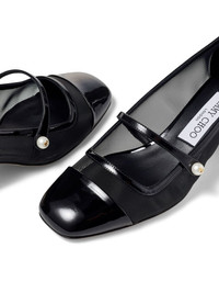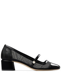 Elisa 45 leather pumps Exemplary of the brand's sophisticated aesthetic, Jimmy Choo's Elisa pumps are crafted from glossy patent leather and sheer mesh to a square-toe silhouette grounded on a chunky block heel. A dainty strap is embellished with a lustrous pearl, which in turn is punctuated with a golden logo plaque. Highlights - Black - Leather - Patent finish - Mesh panelling - Pearl detail - Gold-tone logo plaque - Strap detailing - Square toe - 45mm block heel - Branded leather insole - Leather outsole Made in Italy Composition Outer: Fabric 90%, Calf Leather 10% Lining: Polyamide 60%, Lamb Skin 40% Sole: Calf Leather 100% SIZE & FIT Measurement HEEL 1.77 in(4.5 cm) Sole height 0.39 in(1 cm)