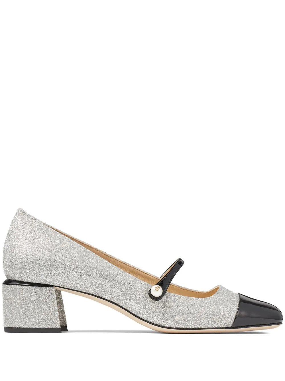 Elisa glitter-embellished 45mm pumps Crafted in Italy and defined by its glittery upper, Jimmy Choo's Elisa pumps are trimmed at the toe with patent-finish leather and elevated with an iridescent pearl at the side. The pair sits atop a mid-block heel for a retro-inspired silhouette. Highlights - Silver-tone/black - Patent finish - Glitter detailing - Square toe - Crossover strap detail - Faux-pearl embellishment - Branded leather insole - Mid block heel Made in Italy Composition Lining: Leather 100% Sole: Leather 100% Outer: Patent Leather 100%, Fabric 100%, Glitter 100% SIZE & FIT Measurement HEEL 1.77 in(4.5 cm)