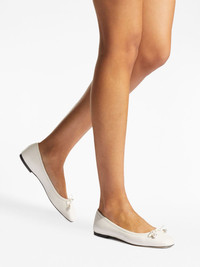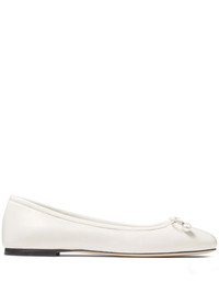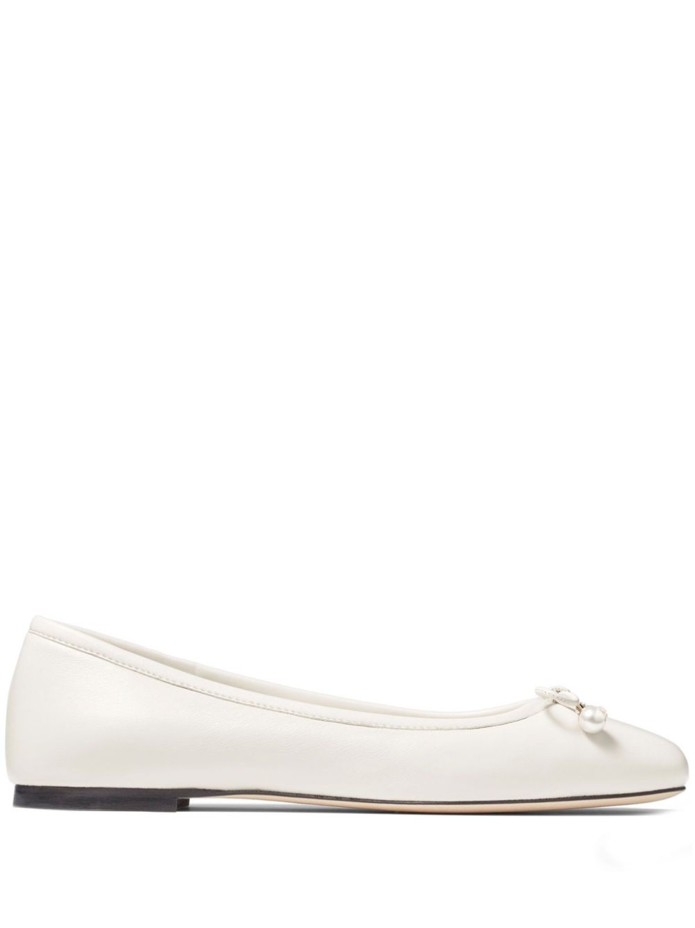 Elme ballerina shoes Defined by a square toe with a crystal-embellished pearly accented bow, these ballerina shoes show why Jimmy Choo is renowned for its sleek Italian craftsmanship. They're crafted from white smooth leather and sit atop a flat sole. Highlights - White - Leather - Bow detailing - Square toe - Branded insole - Flat sole - Wardrobe icon Made in Italy Composition Outer: Lambskin 100% Sole: CALFSKIN 95%, Rubber 5% Lining: Lambskin 100%