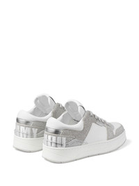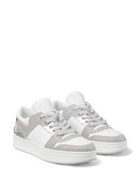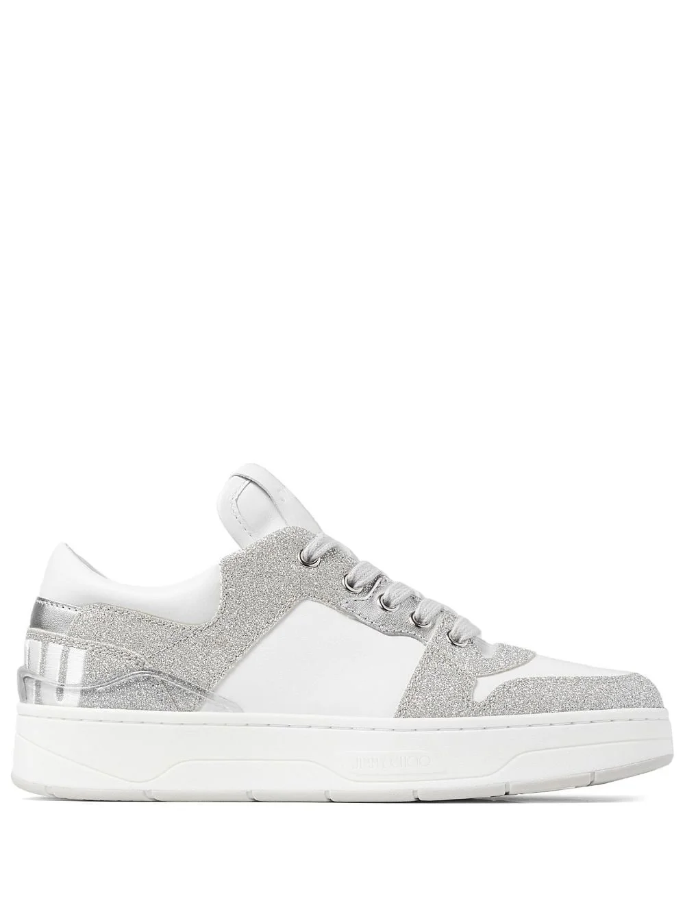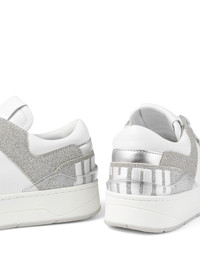 Florent lace-up sneakers A combination of leather and tactile canvas, the Florent sneakers are prompted by colour-block glitter panels. At the heel, maxi embroidered letters form the words ‘Jimmy Choo’, one on each foot, for a fun branded touch. Highlights - White/silver-tone - Calf leather - Glitter detailing - Colour-block panelled design - Embroidered logo to the rear - Logo patch at the tongue - Branded insole - Front lace-up fastening - Round toe - Flat rubber sole Made in United Kingdom Composition Leather 100% SIZE & FIT Measurement HEEL 1.37 in(3.5 cm) Sole height 0.98 in(2.5 cm)