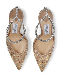 100mm Saeda crystal-embellished pumps Jimmy Choo continues to create stunning footwear, updating classic pieces with striking elements. Part of the SS24 collection, this Saeda iteration appears in gradient crystal embellishments that offer a sparkling finish to the sharp silhouette. Highlights - Gold-tone - Calf leather - Crystal embellishment - Pointed toe - Branded leather insole - Crystal-embellished ankle strap - 100mm high cone heel Made in Italy Composition Lining: Goat Skin 100% Sole: Calf Leather 100% Outer: Fabric 61%, Crystal 20%, Metal 9%, Salpa 5%, Plastic 5% SIZE & FIT Measurement HEEL 3.93 in(10 cm)