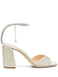 Saeda Sandal Block Heel 85 Platinum Ice Glitter Sandals with Crystal Chain