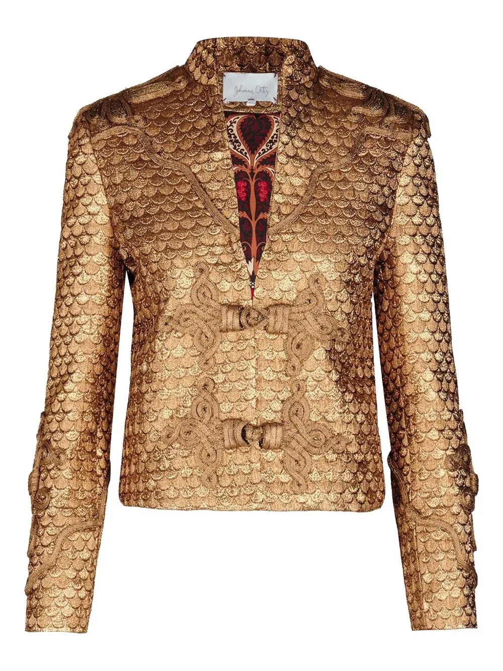 Boldness scale-pattern knot-detail jacket Highlights - Gold-tone - Scale pattern - Knot detail - Long sleeves - Mandarin collar - Embroidered detailing Imported Composition Acrylic 45%, Cellulose Acetate 41%, Polyester 14% Washing instructions Read Manufacturer Guidelines