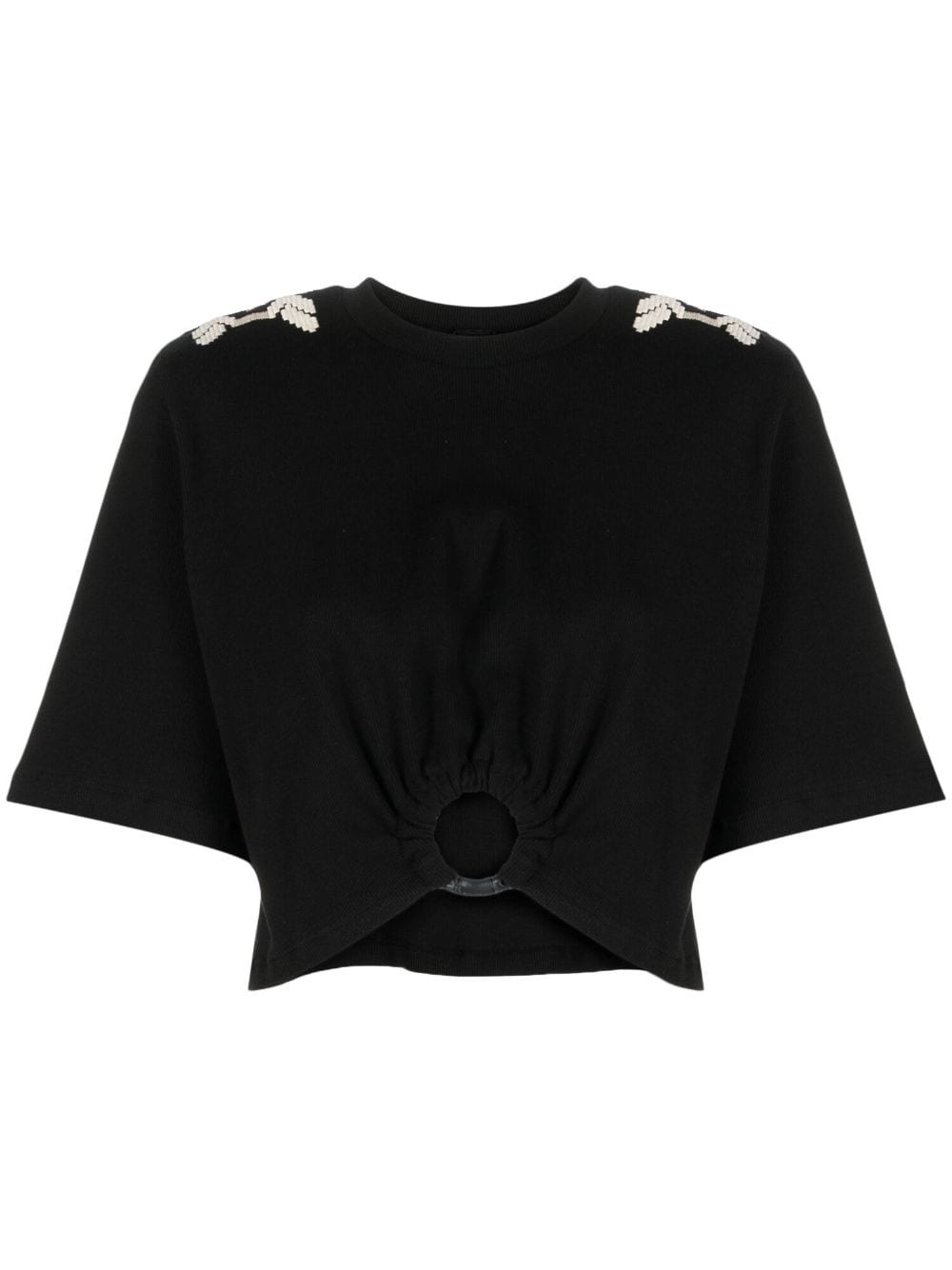 Ensenada embroidered cropped T-shirt Embracing Johanna Ortiz's artisanal aesthetic, this Ensenada T-shirt is stitched with eclectic embroidery at the shoulders that speaks to the designer’s Colombian roots. It’s cut from stretch cotton with a gathered O ring at the front that draws the eye to the cropped hem. Highlights - Black - Stretch-cotton - Embroidered design - Ring embellishment - Cut-out detailing - Crew neck - Short sleeves - Asymmetric hem - Cropped Imported Composition Cotton 96%, Elastane 4% SIZE & FIT Model measurements Height 5 ft 11 in(1.8 m) Bust/Chest 34.25 in(87 cm) Hips 35.82 in(91 cm) Waist 24.8 in(63 cm) FittingInformation Designed for a slim fit that sits just away from the body offering a close yet comfortable fit The internal shoulder pads offer a structured shape Made from a midweight stretch fabric, this piece offers elasticity and flexibility when worn This piece fits true to size – take your usual size Washing instructions Dry Clean Only