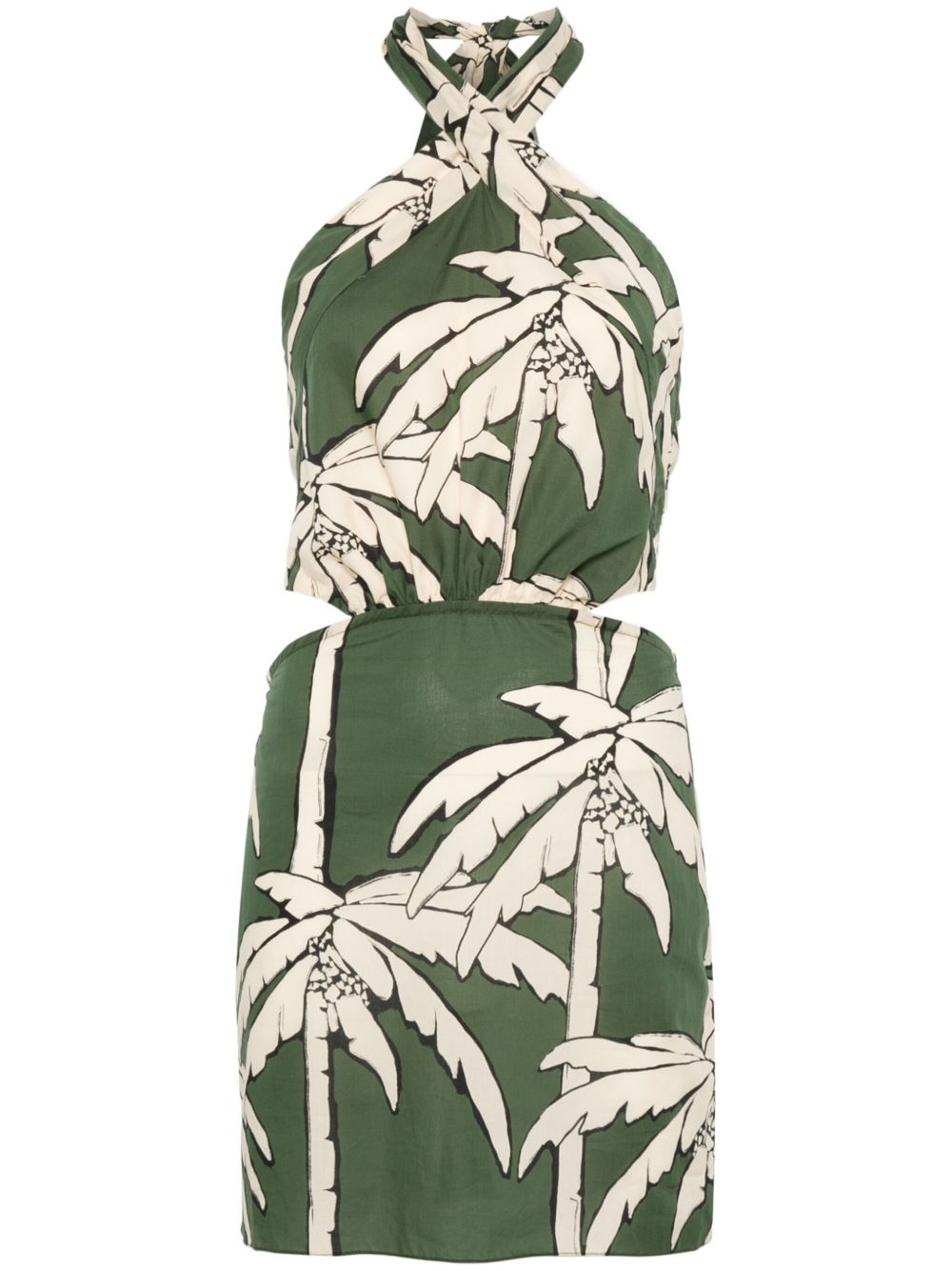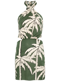 Heart Pirate mini dress Highlights - Forest green - Halterneck tie fastening - Rear tie fastening - Rear elasticated waistband - Palm tree print Imported Composition Cotton 100% SIZE & FIT Model measurements Height 5 ft 10 in(1.78 m) Bust/Chest 33.46 in(85 cm) Hips 36.22 in(92 cm) Waist 23.22 in(59 cm) FittingInformation Designed for a slim fit that sits just away from the body offering a close yet comfortable fit The partially elasticated waistband offers increased movement and comfort at the waist Made from a lightweight non-stretch fabric