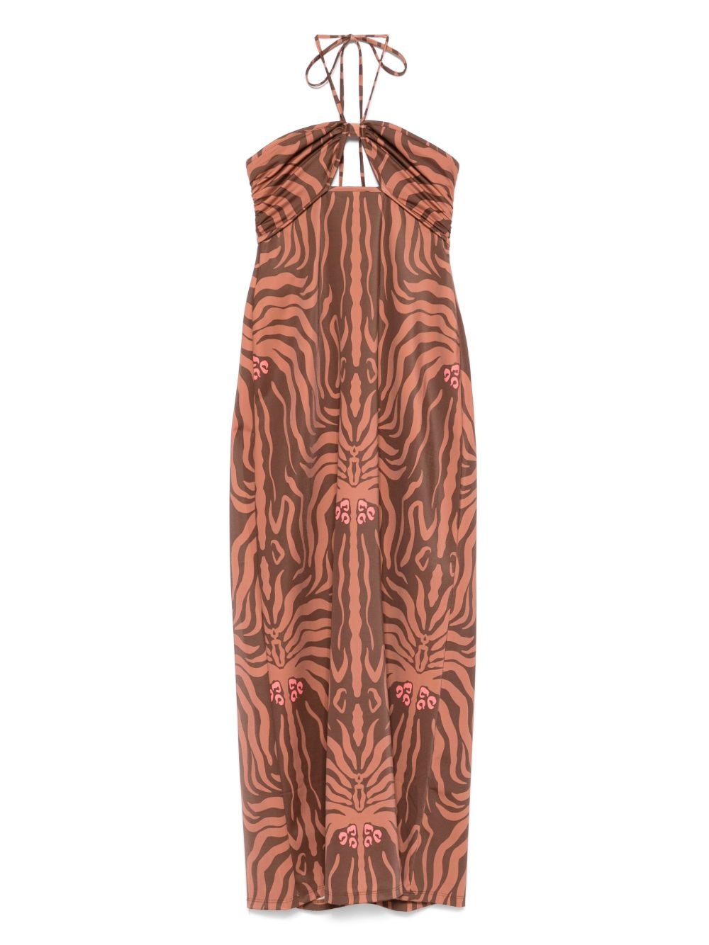 Jungle Palms midi dress Highlights - Cognac brown - Halterneck tie fastening - Rear clasp fastening - Cut-out detailing - Ruched detailing Imported Composition Recycled Polyamide 78%, Elastane 22% SIZE & FIT Model measurements Height 5 ft 10 in(1.79 m) Bust/Chest 33.07 in(84 cm) Hips 35.82 in(91 cm) Waist 24.01 in(61 cm) FittingInformation Designed for a slim fit that sits just away from the body offering a close yet comfortable fit Made from a midweight stretch fabric, this piece offers elasticity and flexibility when worn