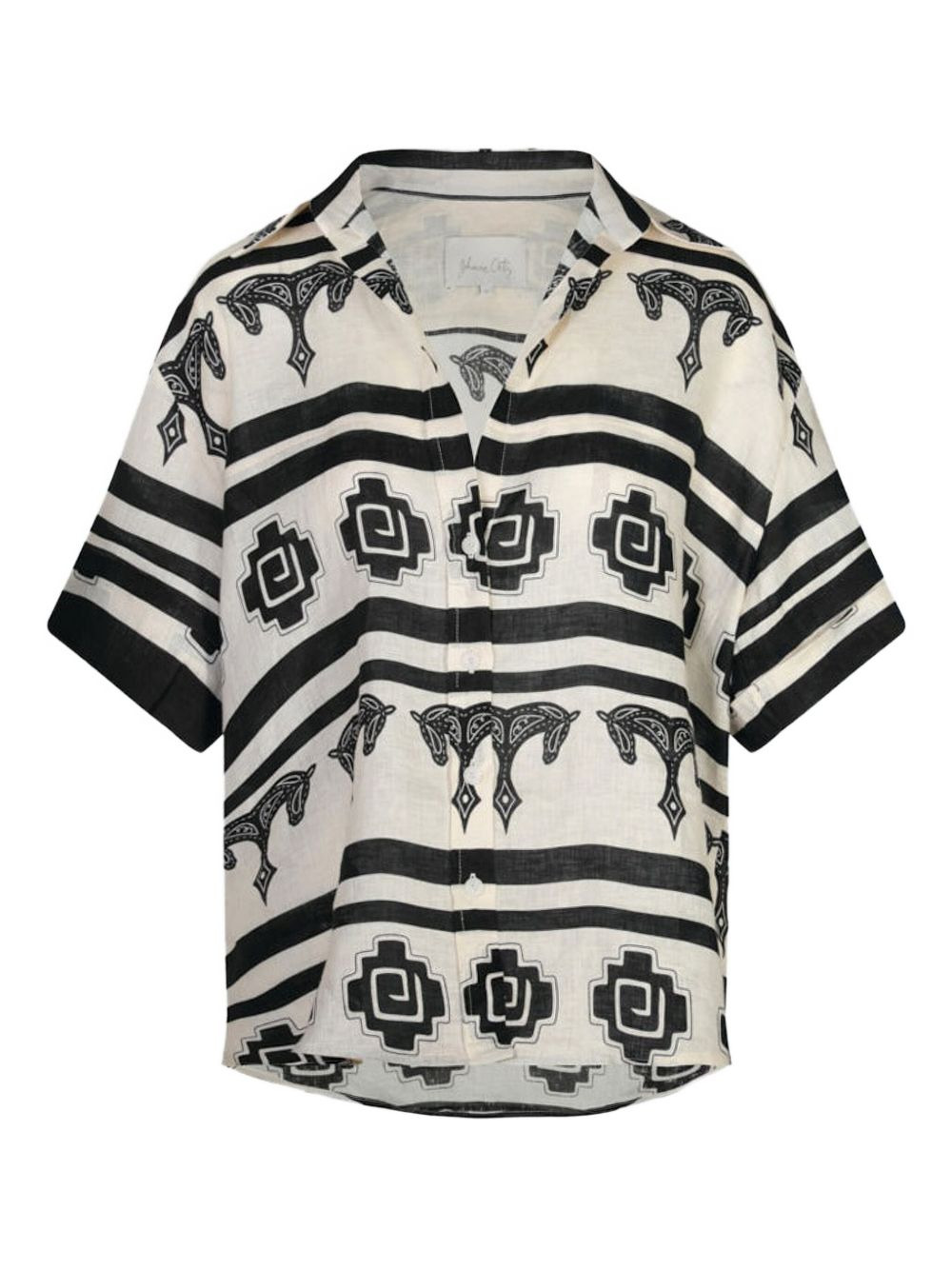 La Creciente horse-print striped shirt Highlights - Ecru and black - Horse print - Black stripe - Short sleeves - Collared neck Imported Composition Linen/Flax 100% Washing instructions Read Manufacturer Guidelines