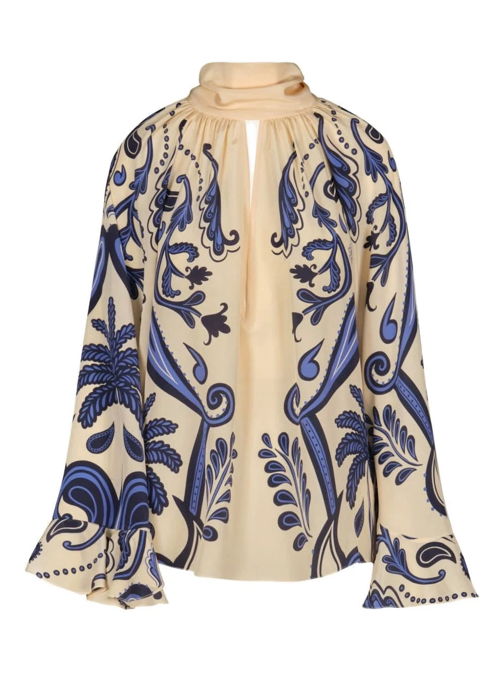 Ritmo Sol ruffled printed blouse Highlights - Neutrals - Keyhole detail - High neck - Long sleeves - Ruffled cuffs Imported Composition Silk 100% Washing instructions Read Manufacturer Guidelines
