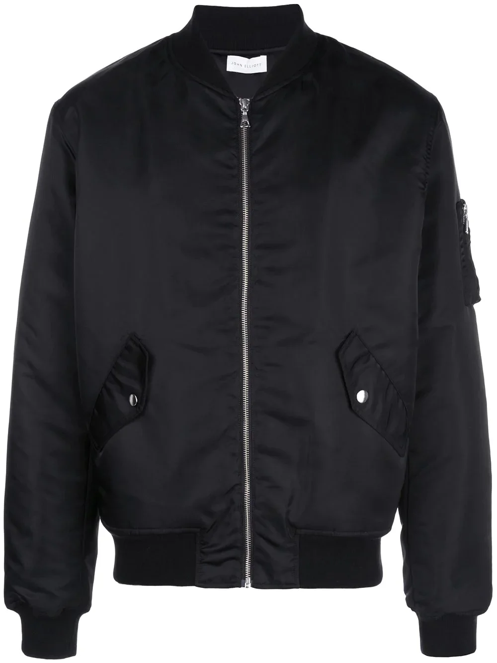 Bogota Bomber II bomber jacket Black Bogota Bomber II bomber jacket from John Elliott featuring long sleeves, a relaxed fit, front pockets, ribbed trimming and a front zip fastening. Imported Composition Cotton 86%, Polyester 11%, Polyurethane 3% Outer: Nylon 100% Lining: Polyester 100% SIZE & FIT Model measurements Height 6 ft 2 in(1.88 m) Bust/Chest 38.18 in(97 cm) Hips 37 in(94 cm) Waist 29.92 in(76 cm) Washing instructions Dry Clean Only