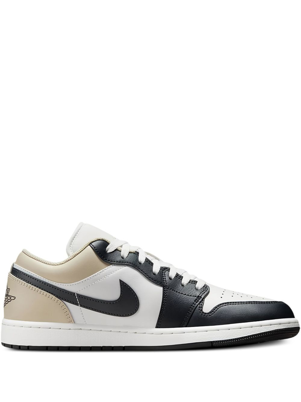 Air Jordan 1 logo-print sneakers Highlights - White - Black panel - Logo print - Lace-up fastening - Rubber sole Imported Composition Sole: Rubber 100% Lining: Fabric 100% Outer: Calf Leather 100%