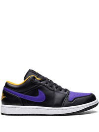 Air Jordan 1 Low "Dark Concord" sneakers The Air Jordan 1 Low "Dark Concord" sneakers stand out thanks to their sleek black design with purple and yellow accents. This model is crafted from leather and is highlighted with a purple Swoosh on the sides and a yellow Wings insignia at the rear. Underneath, a two-tone rubber sole completes the design. Highlights - Black/dark purple/yellow - Leather - Signature swoosh logo detail - Signature air jordan wings logo - Round toe - Front lace-up fastening - Logo patch at the tongue - Branded insole - Rubber sole - These styles are supplied by a premium sneaker marketplace. stocking only the most sought-after footwear, they source and curate some of the most hard to find sneakers from around the world. Imported Composition Leather 100%