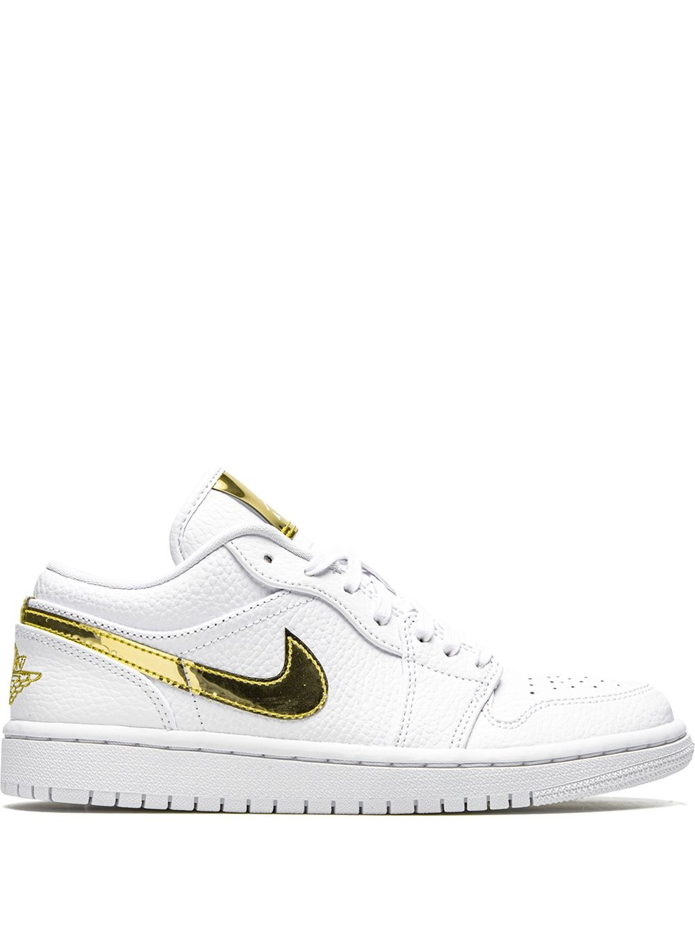Air Jordan 1 Low SE "White Metallic Gold" sneakers Treat your feet to a timeless silhouette. These white and gold-tone Air Jordan 1 Low SE sneakers from Jordan are all about function meets practicality. Invest wisely. Highlights - White/gold-tone - Leather/rubber - Signature swoosh logo detail - Round toe - Front lace-up fastening - Logo patch at the tongue - Branded insole - Rubber sole - These styles are supplied by a premium sneaker marketplace. stocking only the most sought-after footwear, they source and curate some of the most hard to find sneakers from around the world. Imported Composition Leather 100% SIZE & FIT FittingInformation This piece fits small – take one size up