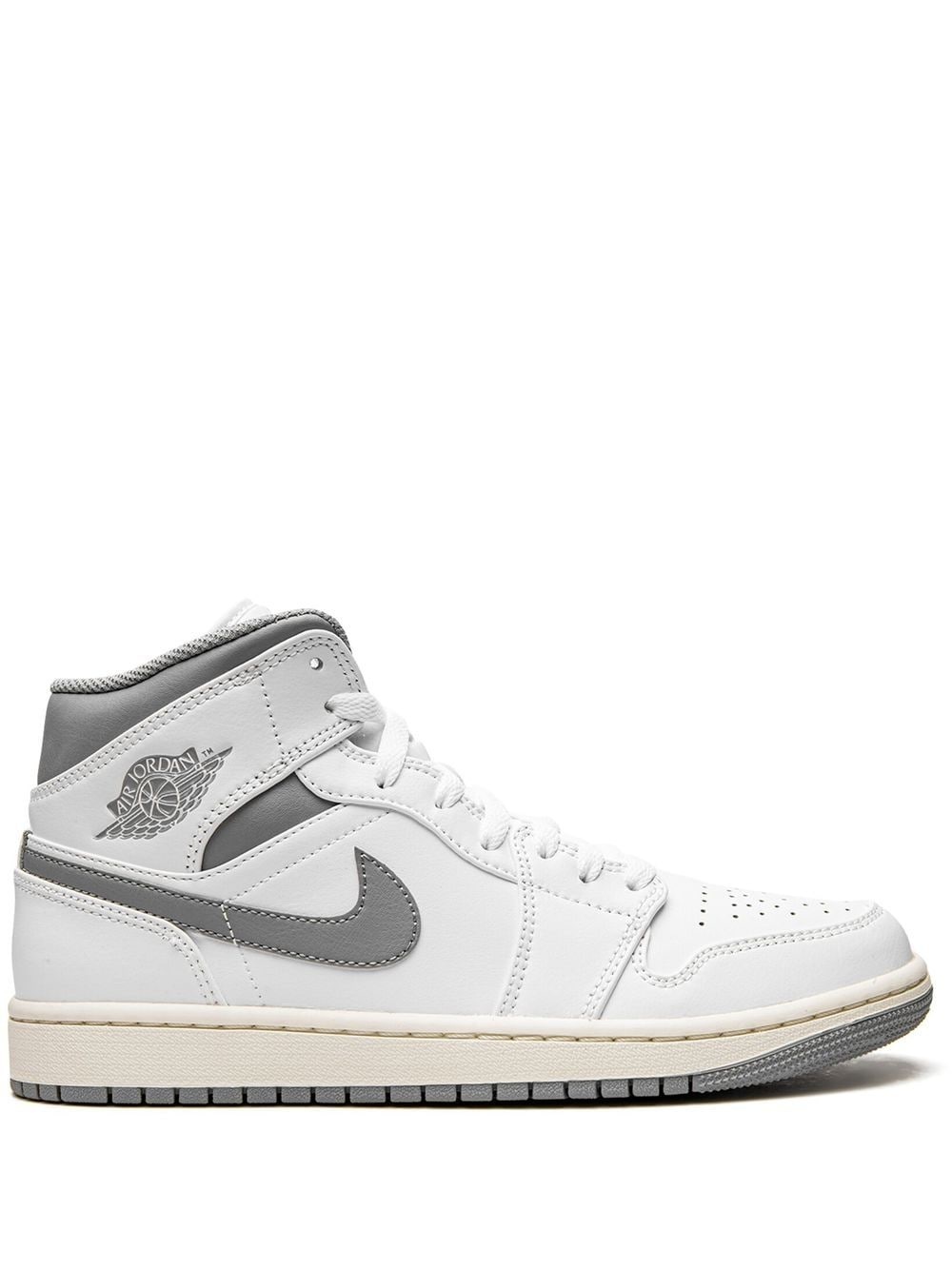 Air Jordan 1 Mid "White/Stealth Grey" sneakers A heritage style, the Air Jordan 1 Mid is presented in a white and stealth grey colourway here. Featuring the signature Swoosh logo and a supportive ankle-length construction, this pair offers a classic design. Highlights - Grey/white - Calf leather - Panelled design - Signature swoosh logo detail - Signature air jordan wings logo - Round toe - Front lace-up fastening - Ankle-length - Rubber sole - These styles are supplied by a premium sneaker marketplace. stocking only the most sought-after footwear, they source and curate some of the most hard to find sneakers from around the world. Imported Composition Leather 100% SIZE & FIT Measurement HEEL 1.18 in(3 cm) Sole height 0.78 in(2 cm) HEIGHT 4.33 in(11 cm)