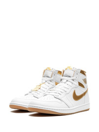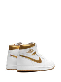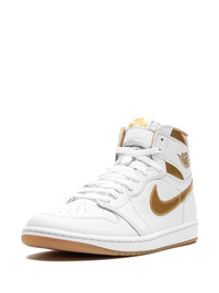 Air Jordan 1 Retro High OG "Metallic Gold" sneakers Jordan's iconic Air Jordan 1 Retro High OG sneakers are a gilded take on MJ’s first signature model. They’re crafted from pristine white leather with glossy gold accents and a detachable logo charm at the laces of the right foot. The Wings and Swoosh logos are the same as the prototype so there’s no mistaking their origins. Highlights - White/gold-tone - Leather - Signature swoosh logo detail - Signature air jordan wings logo - Front lace-up fastening - Detachable gold-tone logo charm - Padded ankle - Logo patch at the tongue - Perforated toebox - Round toe - Branded insole - Signature air cushioning - Rubber sole - These styles are supplied by a premium and authenticated sneaker marketplace. stocking only the most sought-after footwear, they source and curate some of the most hard to find sneakers from around the world. Imported Composition Leather 100%