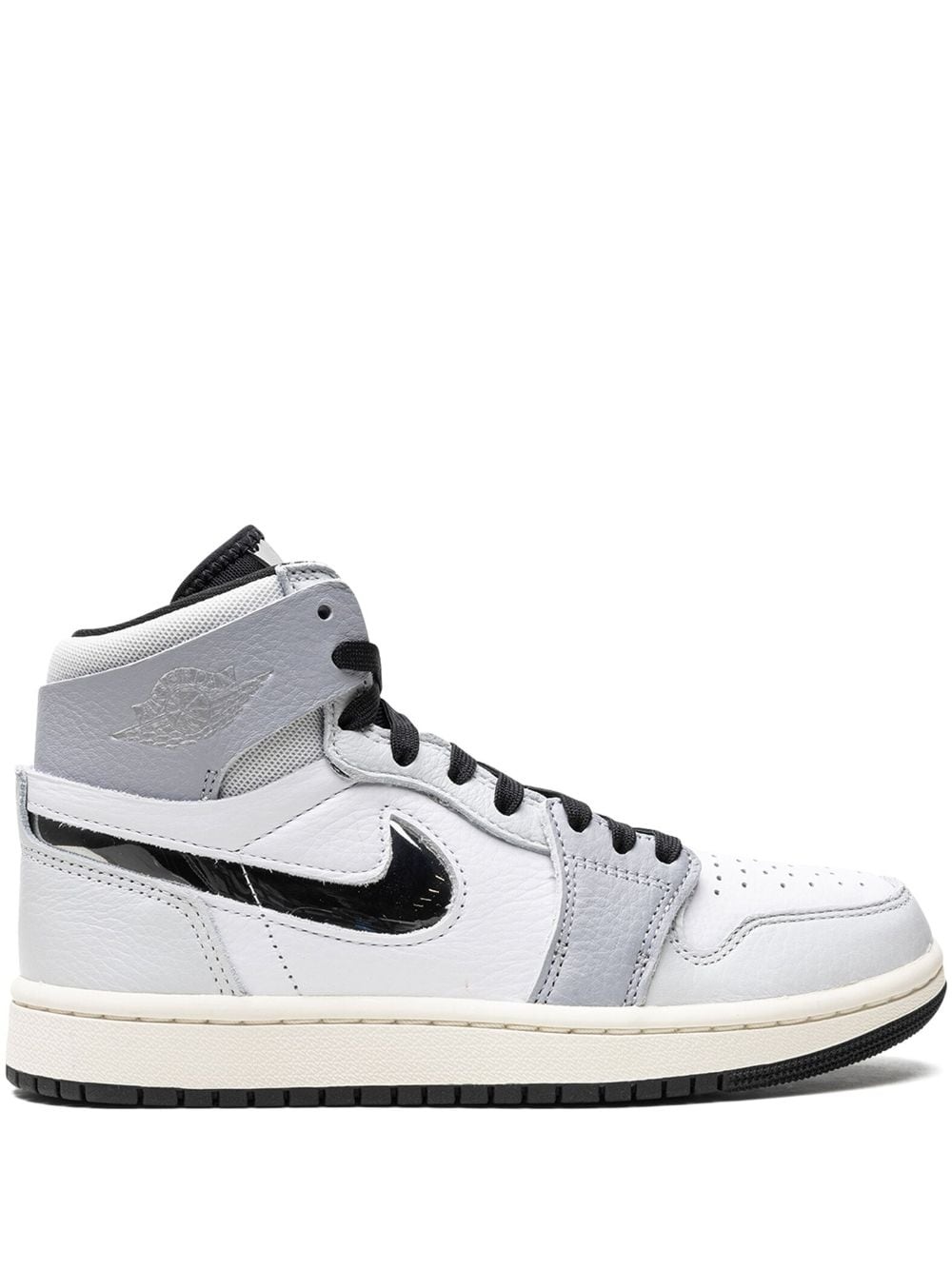 Air Jordan 1 Zoom CMFT 2 "Metallic Silver" sneakers The Air Jordan 1 High Zoom Air CMFT 2 by Jordan Brand updates the ’85 classic with a 'Metallic Silver' colourway. This model is crafted from leather with perforated details at the toe for breathability, and is enhanced with a Swoosh logo and a Wings insignia on the sides. Underneath, a two-tone rubber sole completes the look. Highlights - White/grey - Leather - Panelled design - Signature swoosh logo detail - Logo patch at the tongue - Front lace-up fastening - Perforated toebox - Round toe - Flat rubber sole - These styles are supplied by a premium and authenticated sneaker marketplace. stocking only the most sought-after footwear, they source and curate some of the most hard to find sneakers from around the world. Imported Composition Leather 100%